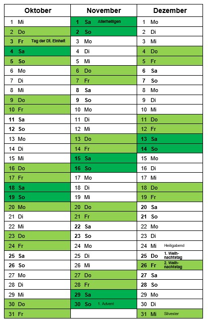 **geöffnete Tage sind im Kalender grün gekennzeichnet**